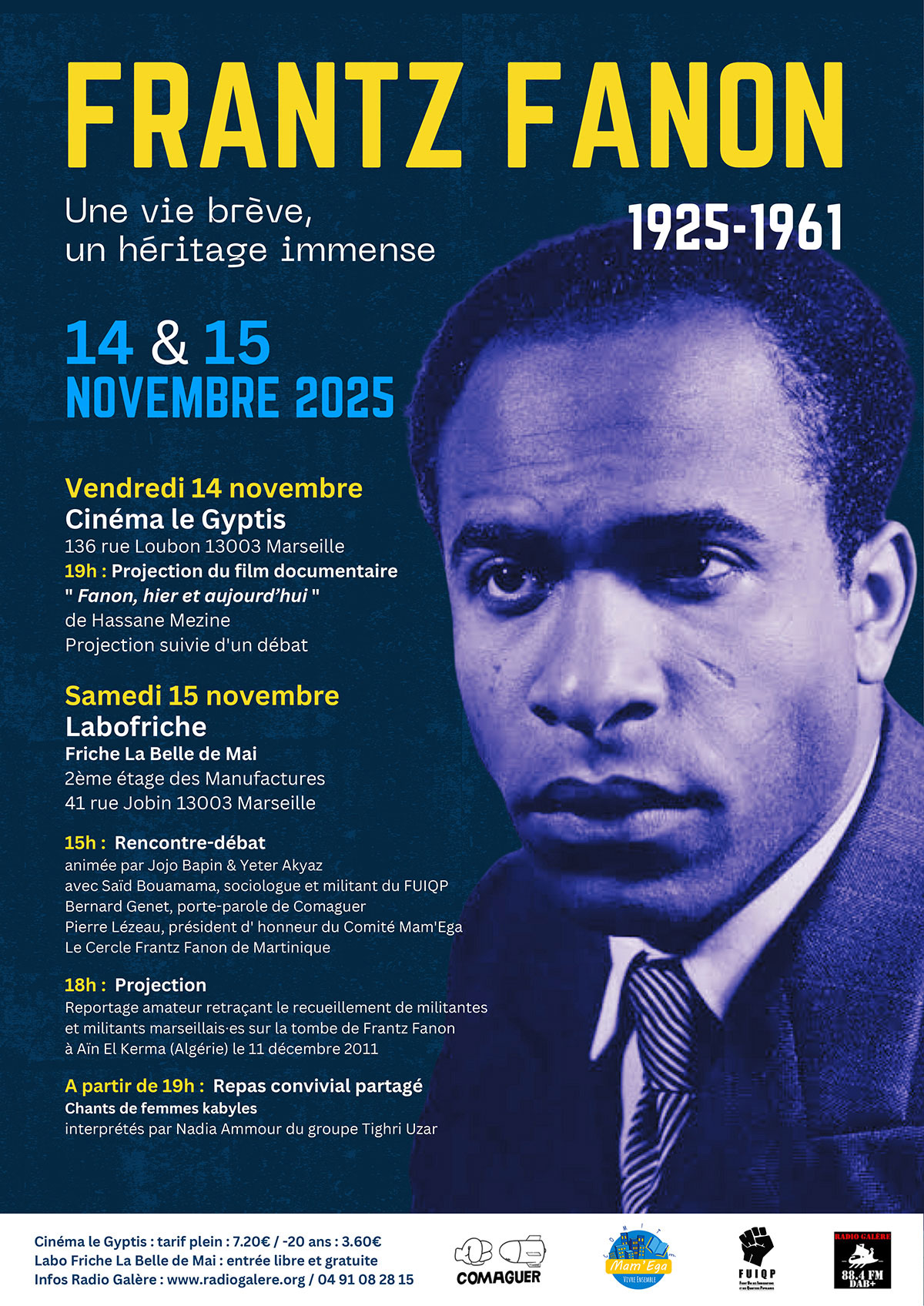 C’est dans cet esprit que : le Front Uni des Immigrations et des Quartiers Populaires, le Collectif Comaguer, le Comité Mam’Ega et le Cercle Frantz Fanon de Martinique, avec la participation de Radio Galère et du Cinéma Le Gyptis, organisent à Marseille une commémoration du centenaire de Frantz Fanon vendredi 14 et samedi 15 novembre 2025.